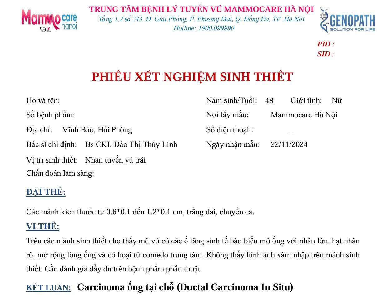 Người thứ ba, 42 tuổi, kết quả còn đáng lo hơn khi bác sĩ mô bệnh học ghi rõ: "Ung thư biểu mô xâm nhập, có hình ảnh xâm nhập quanh thần kinh." Điều này có nghĩa là tế bào ung thư đã có dấu hiệu lan ra ngoài mô vú, và quá trình điều trị sẽ phức tạp hơn.