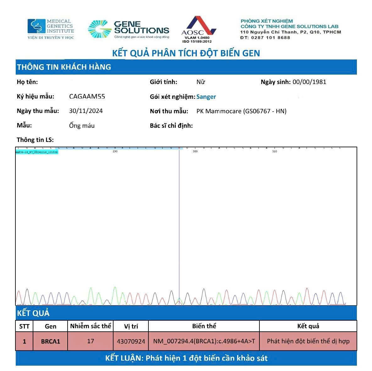 Bệnh nhân có mẹ từng mắc ung thư vú. Sau khi tham khảo ý kiến bác sĩ, cô quyết định thực hiện xét nghiệm di truyền để kiểm tra sự hiện diện của đột biến gen BRCA1 – một trong những yếu tố nguy cơ hàng đầu dẫn đến ung thư vú và ung thư buồng trứng.