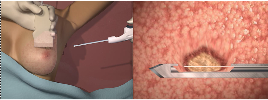 Thực hiện sinh thiết: Kim sinh thiết được đưa vào tuyến vú dưới hướng dẫn của hình ảnh. Hệ thống hút chân không sẽ cắt và hút mẫu mô ra ngoài.