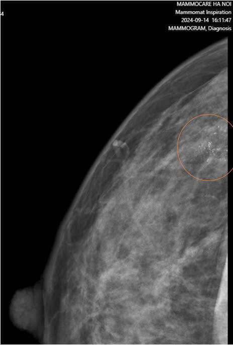 Kết quả chụp nhũ ảnh cho thấy hình ảnh vôi hóa đa hình và vô định hình, tập trung thành nhóm trong một vùng ~11x12mm ở vú phải. Kết hợp với siêu âm, bác sĩ phát hiện một khối giảm âm khá lớn (~7.8x42mm) – dấu hiệu cho thấy một tổn thương đáng ngờ.