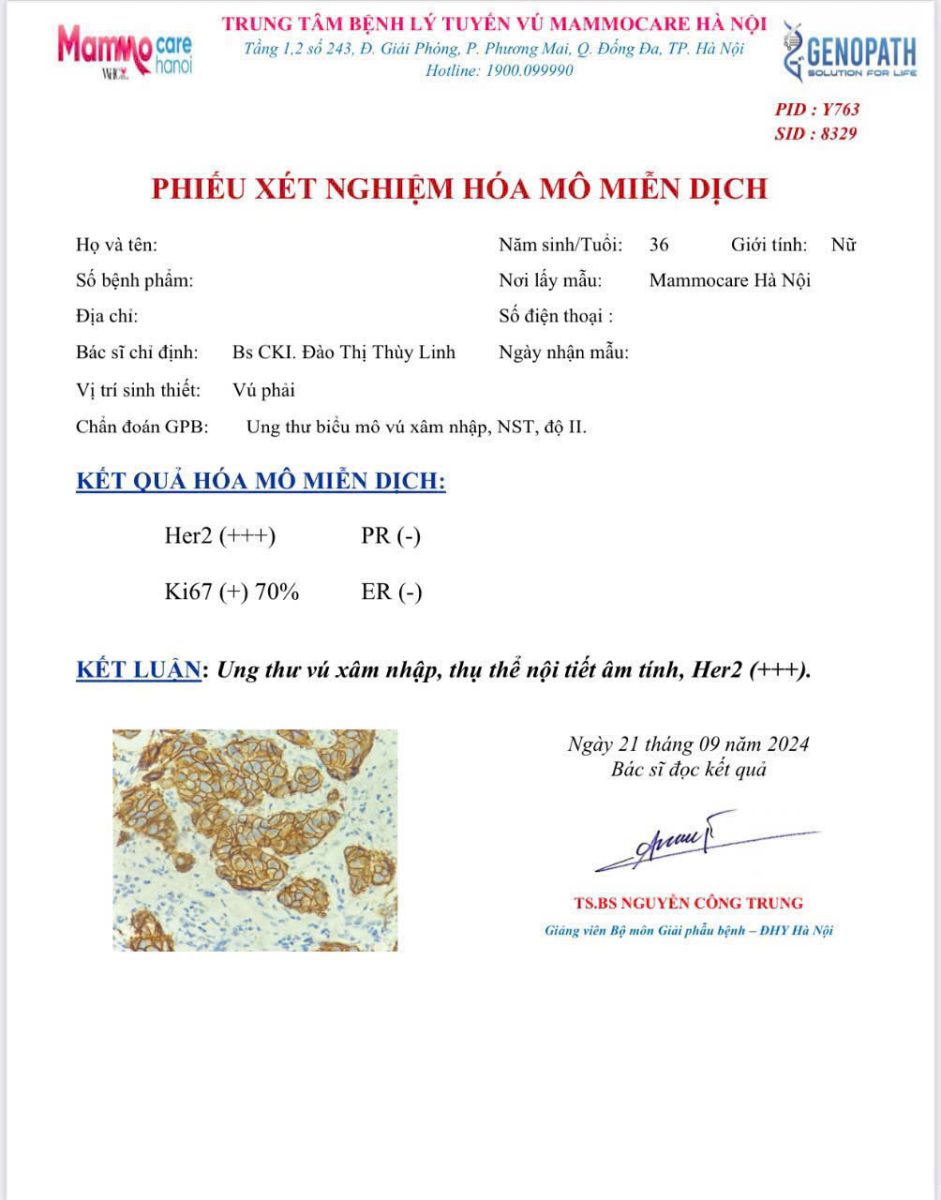 Kết quả sinh thiết xác nhận: Chị N đã mắc ung thư vú xâm nhập. Điều đáng nói là trước đó, chị không có triệu chứng bất thường nào. Nếu không thực hiện kiểm tra, khối u có thể tiếp tục phát triển âm thầm và chỉ được phát hiện ở giai đoạn muộn hơn, khi việc điều trị sẽ khó khăn hơn rất nhiều.